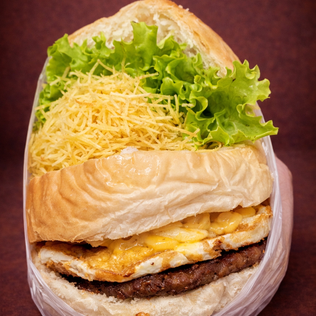 Pão, hamburguer de boi, ovo, queijo, batata palha, alface e molho especial