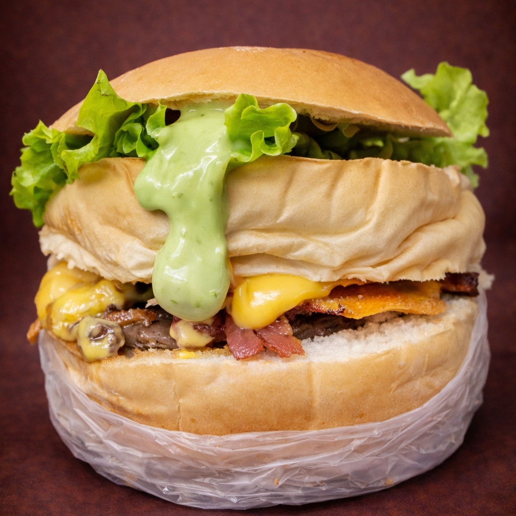 Hambúrguer de picanha 120g, catupiry, ovo, bacon, presunto, batata palha, milho, alface e molho especial