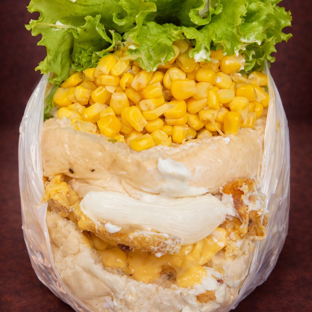 pão, ovo, queijo, Catupiry, batata palha, milho, alface e molho
