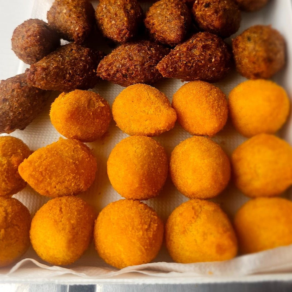 Salgadinhos sortidos entre coxinhas, kibes, travesseirinhos, empadas, etc... Exceto salgados especiais e espetinhos. Salgados tamanho festa entre 18g e 20g.