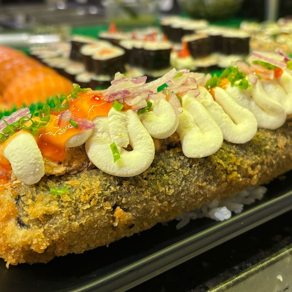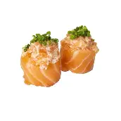 Arroz envolvido por uma fatia de salmão com tataki de salmão, cream cheese, cebolinha e gergelim. .