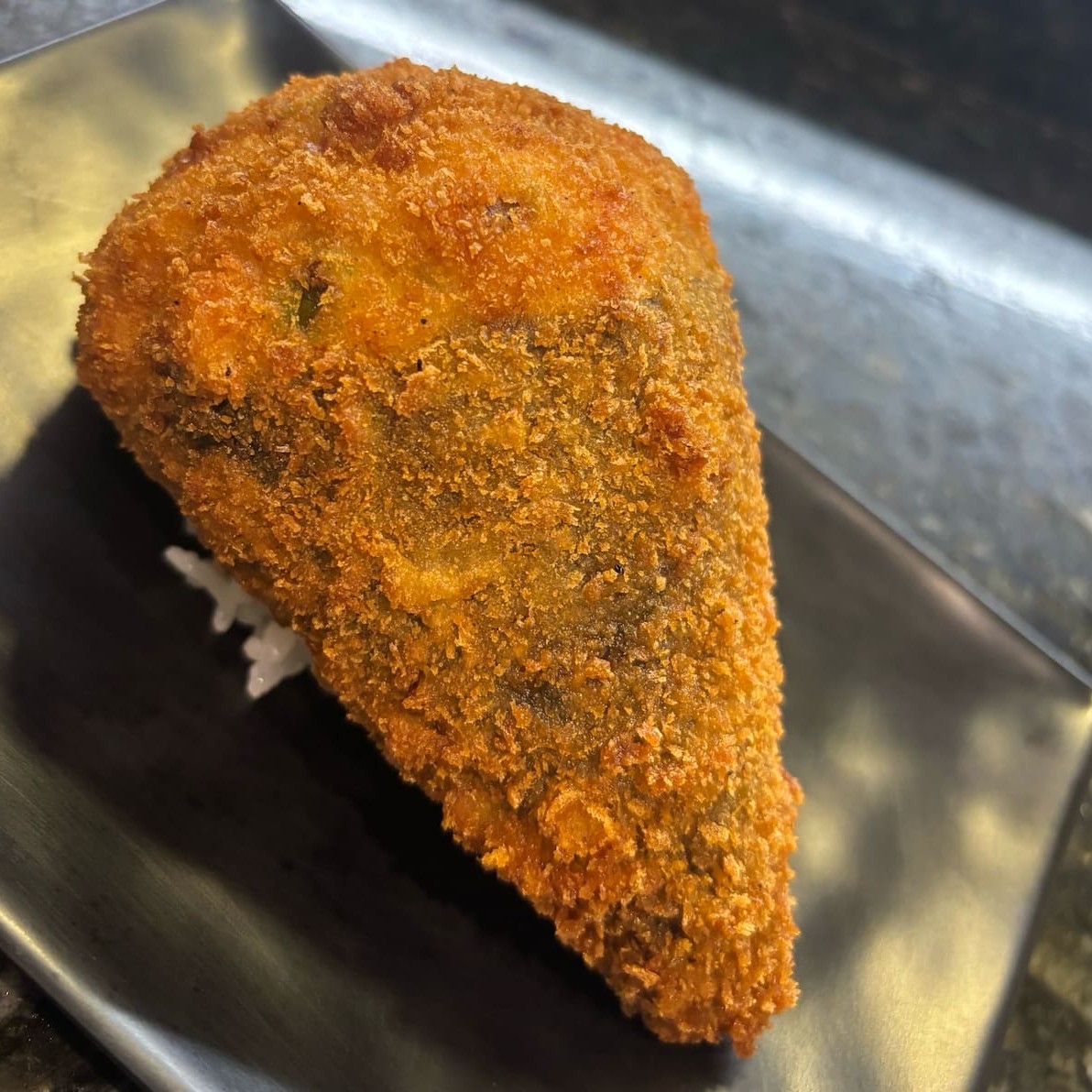 Arroz, salmão, cream cheese e cebolinha. Empanado e frito