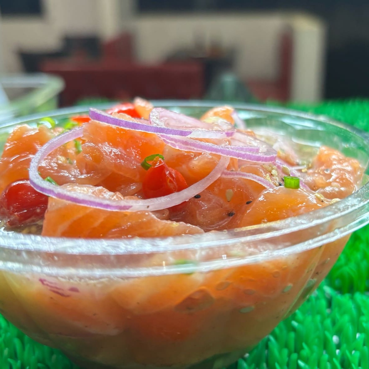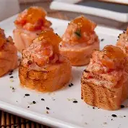 250g de iscas de salmão, acrescentado de cebola roxa, cebolinha, alho torrado e pimenta biquinho, marinados em um molho de limão, laranja e pimenta