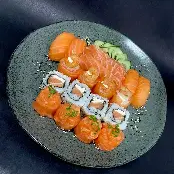 4 sashimis de salmão, 2 sushis de salmão, 2 sushis skin, 2 sushis kani, 4 uramakis salmão grelhado, 4 uramakis camarão, 2 hot's filadélfia. imagem ilustrativa