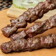 Espeto misto com coração de frango, linguiça e carne bovina, uma combinação perfeita para churrasco.