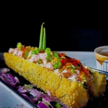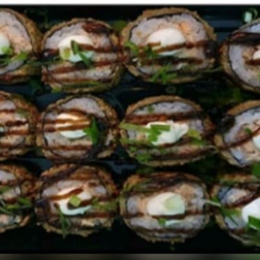 Enrolado com alga por fora, arroz por dentro e recheio de salmão, cream cheese e cebolinha, empanado e frito (Acompanha 2 sache de shoyu 2 sache de tare e 1 par de hashi)