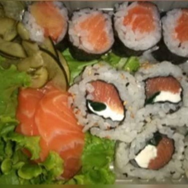 2 Sashimi de salmão 4 Hossomaki de salmão 4 Uramaki filadelfia (Acompanha 2 sache de shoyu 2 sache de tare e 1 par de hashi)