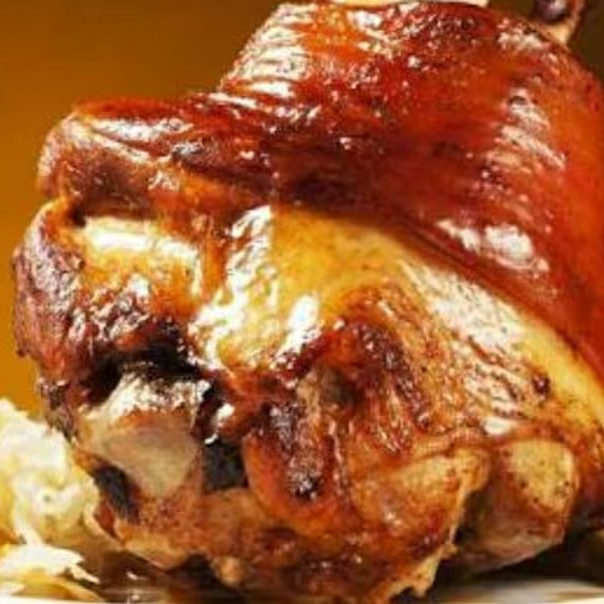 Joelho suíno assado, macio por dentro e com a casquinha crocante por fora, um clássico irresistível.