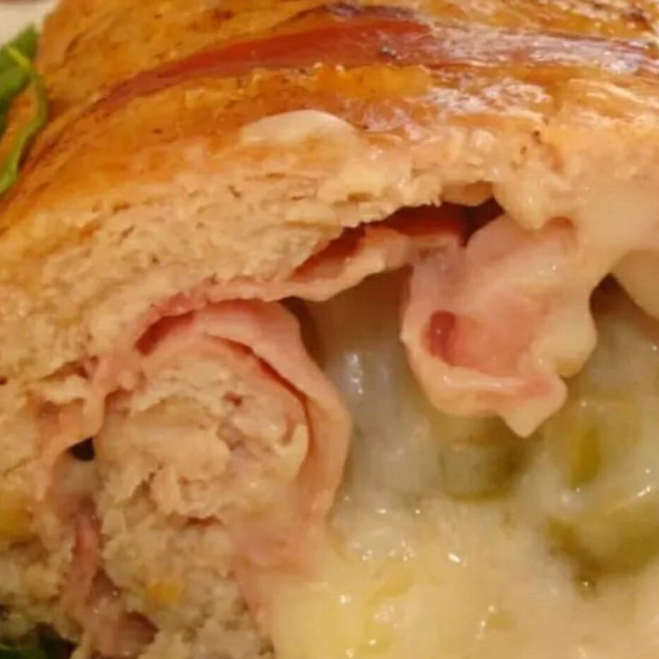 Rocambole artesanal de frango recheado com milho, presunto e catupiry, levemente dourado e suculento.