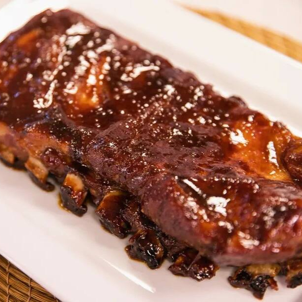 Costela suína assada lentamente, macia e suculenta, regada com molho barbecue artesanal.