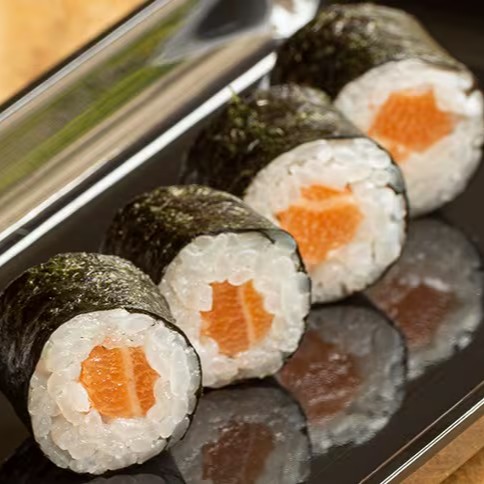 Alga nori e recheio de salmão, envolto em arroz gohan