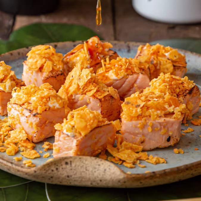 Cubos de salmão maçaricado, finalizado com cream cheese, Doritos ou tomate cereja com manjericão e, geleia de pimenta.