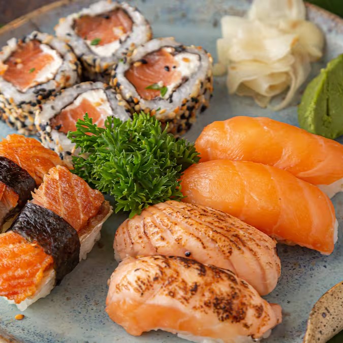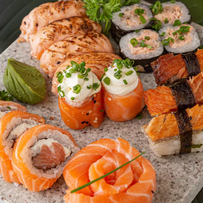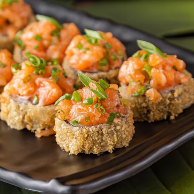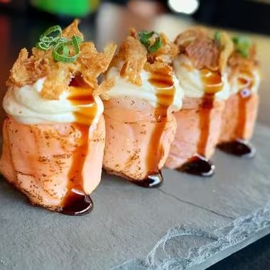 Deliciosa fatia de sashimi maçaricado com recheio de camarão, shimeji ou brócolis, cream cheese, coberto com geleia de pimenta e molho teriaki.