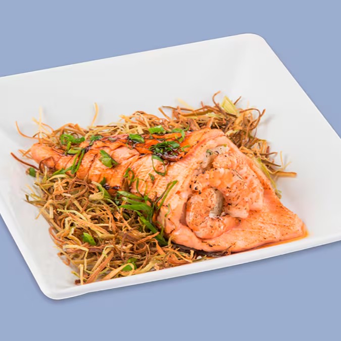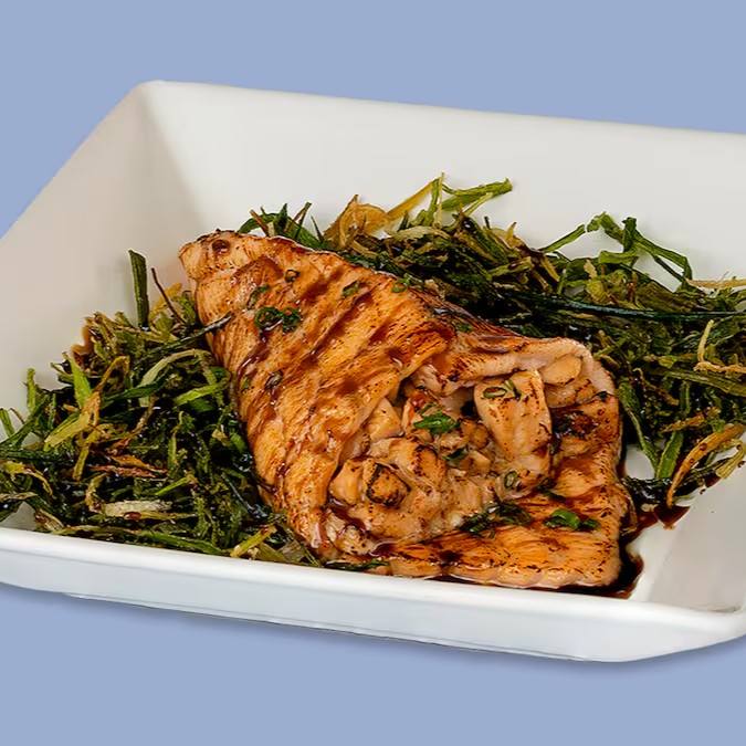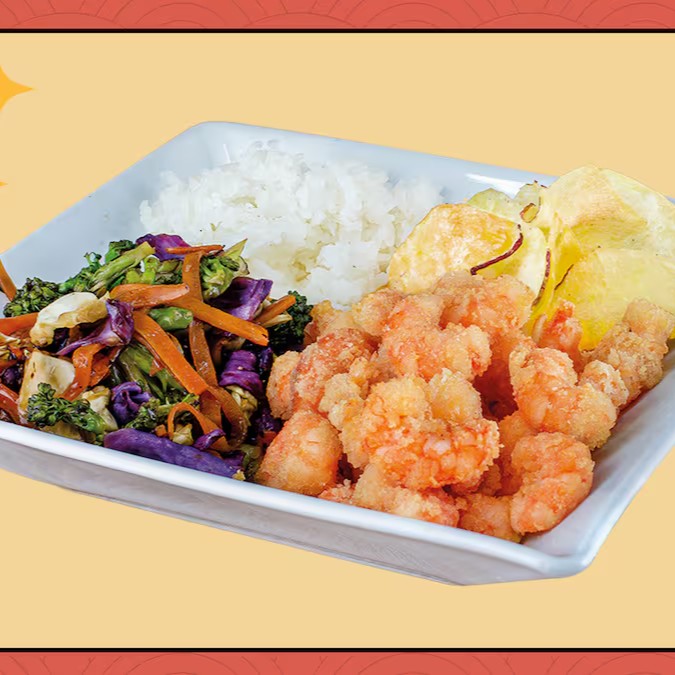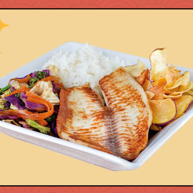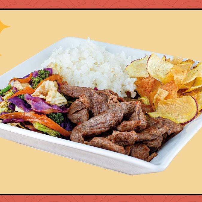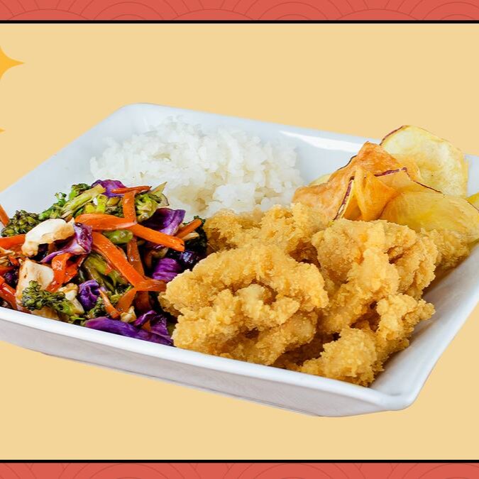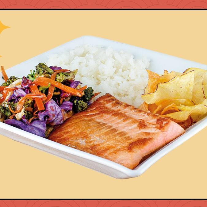 Acompanha arroz japonês, lascas crocantes de batata doce, mix de repolho branco e roxo, cenoura e brócolis temperado com delicioso molho oriental. Molho teriyaki à parte.