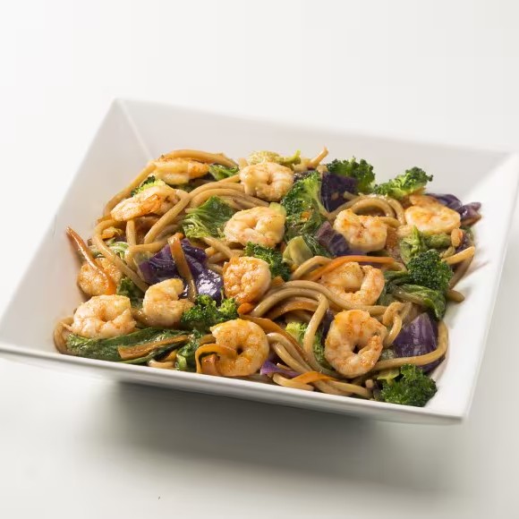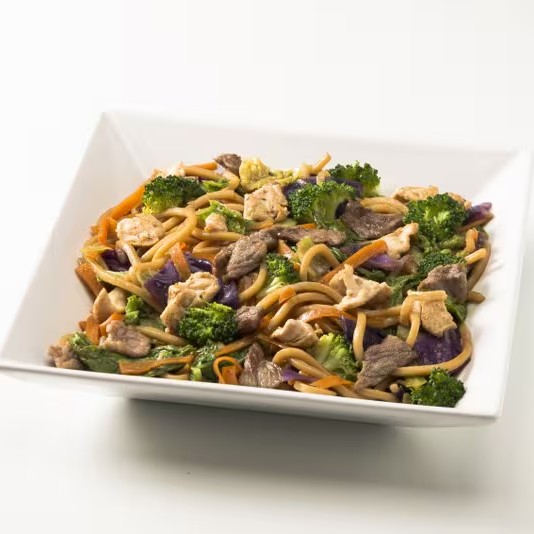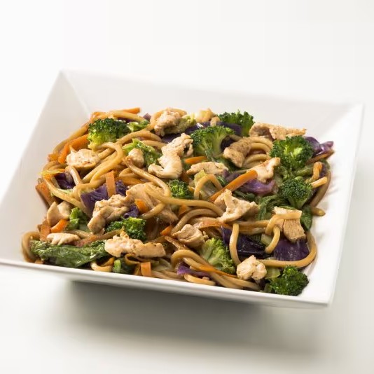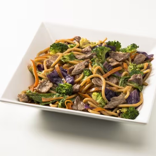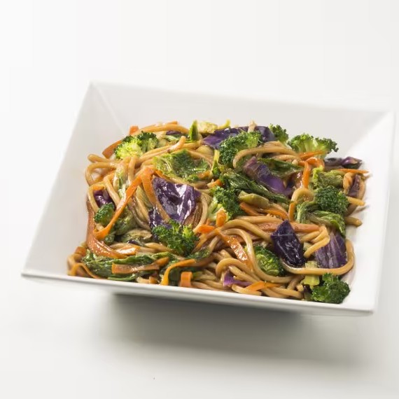 Macarrão frito ao molho oriental com vegetais (repolho roxo e branco, acelga, cenoura e brócolis). Imagens meramente ilustrativas.