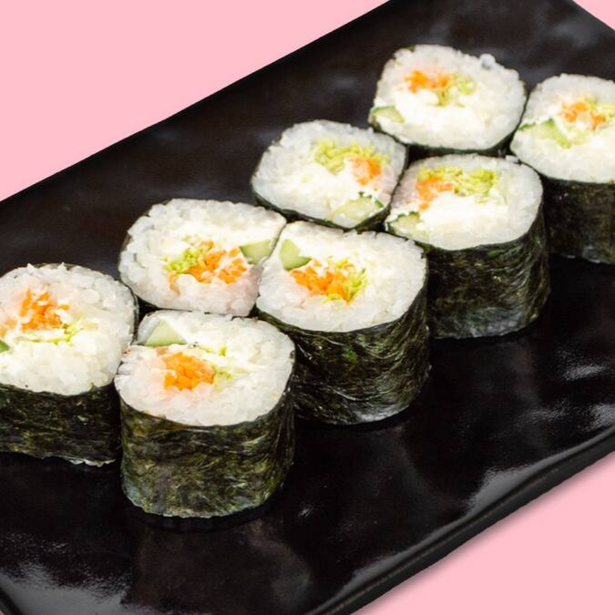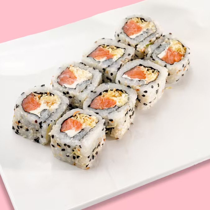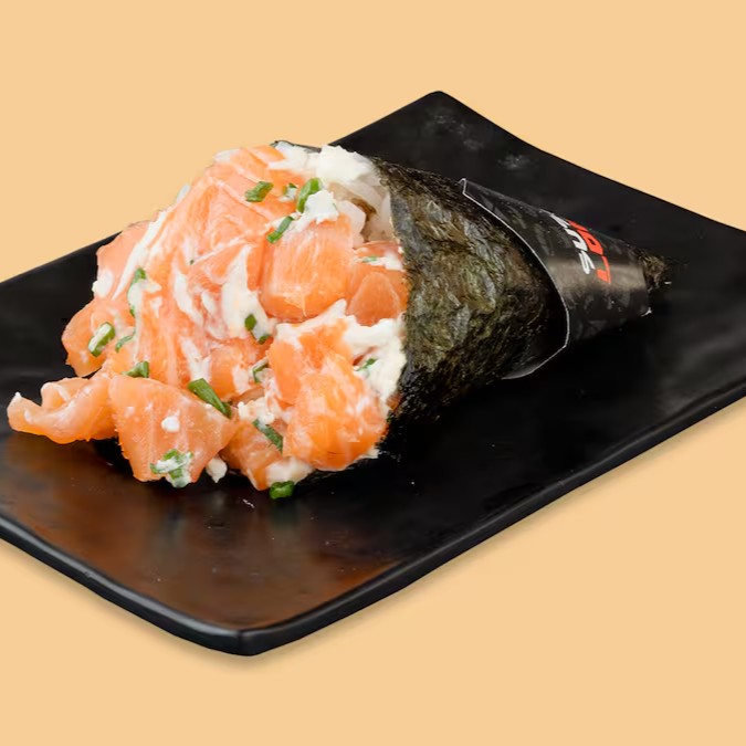 Recheado com cubos de salmão, cream cheese, cebolinha, salsa, pimenta togarashi, hondashi e shoyu. Sem arroz. Imagem meramente ilustrativa.
