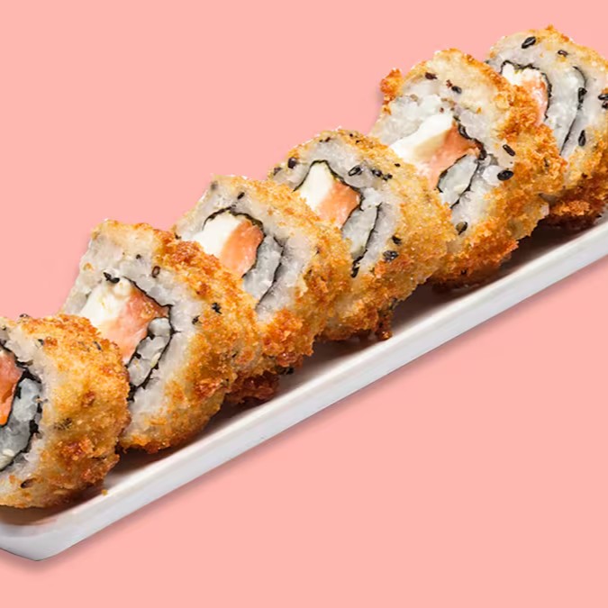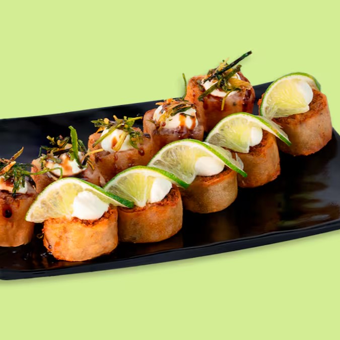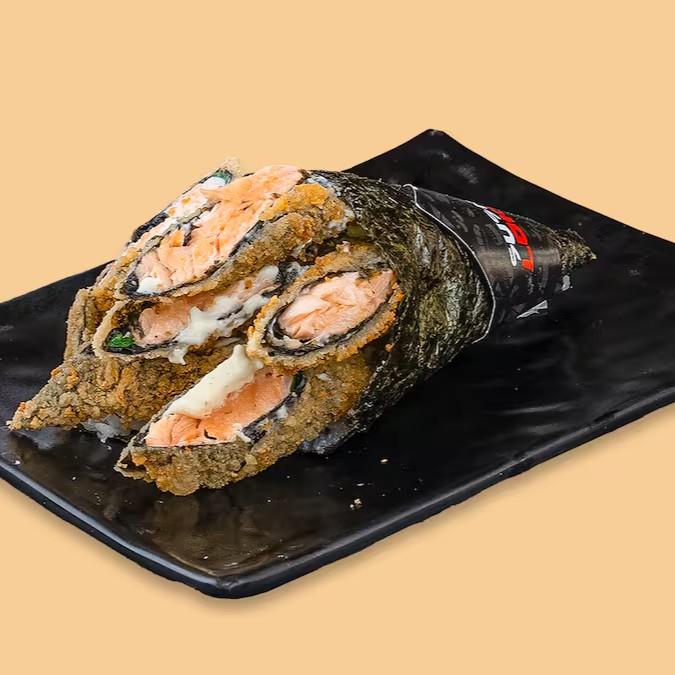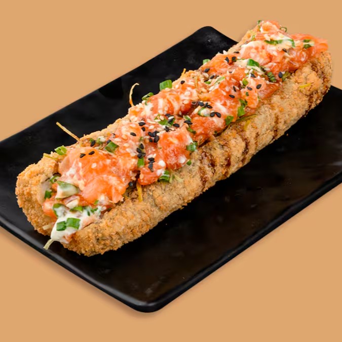 O incrível mega enrolado empanado e frito, com recheio à escolha, cream cheese, alho poró, gergelim e cebolinha. Tudo isso acompanhando do nosso delicioso molho teriaki. Imagens meramente ilustrativas.