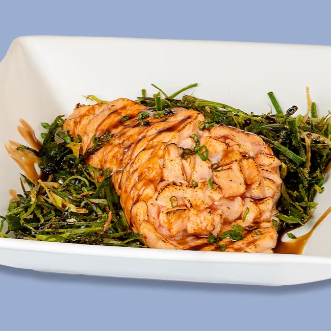 Filé de salmão fresco maçaricado recheado com salmão, arroz japonês, cream cheese e cebolinha, coberto com molho teriaki. Imagem meramente ilustrativa.
