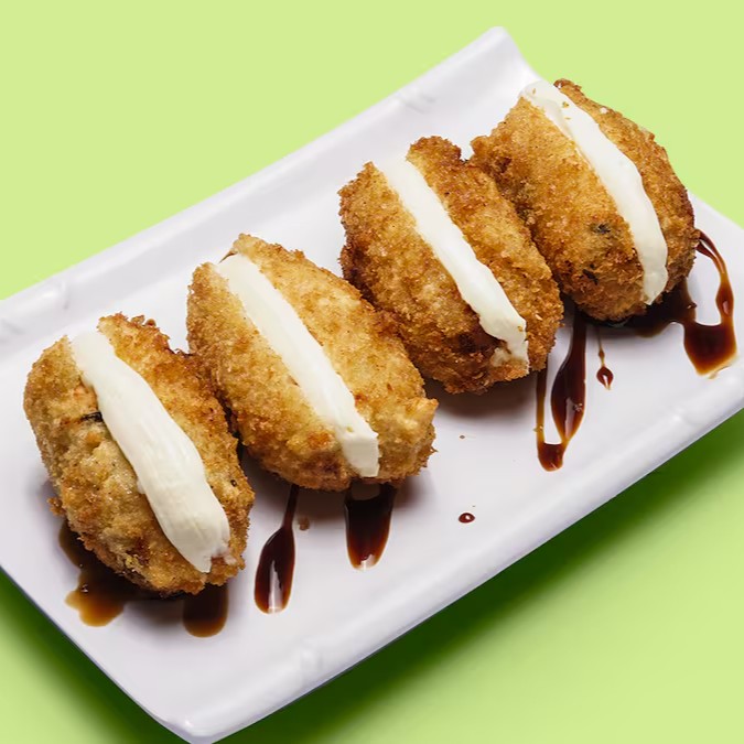Bolinhos de arroz japonês, pimentão, cebolinha e um leve toque de pimenta, cobertos com cream cheese. Acompanha 4 unidades. Imagens meramente ilustrativas.