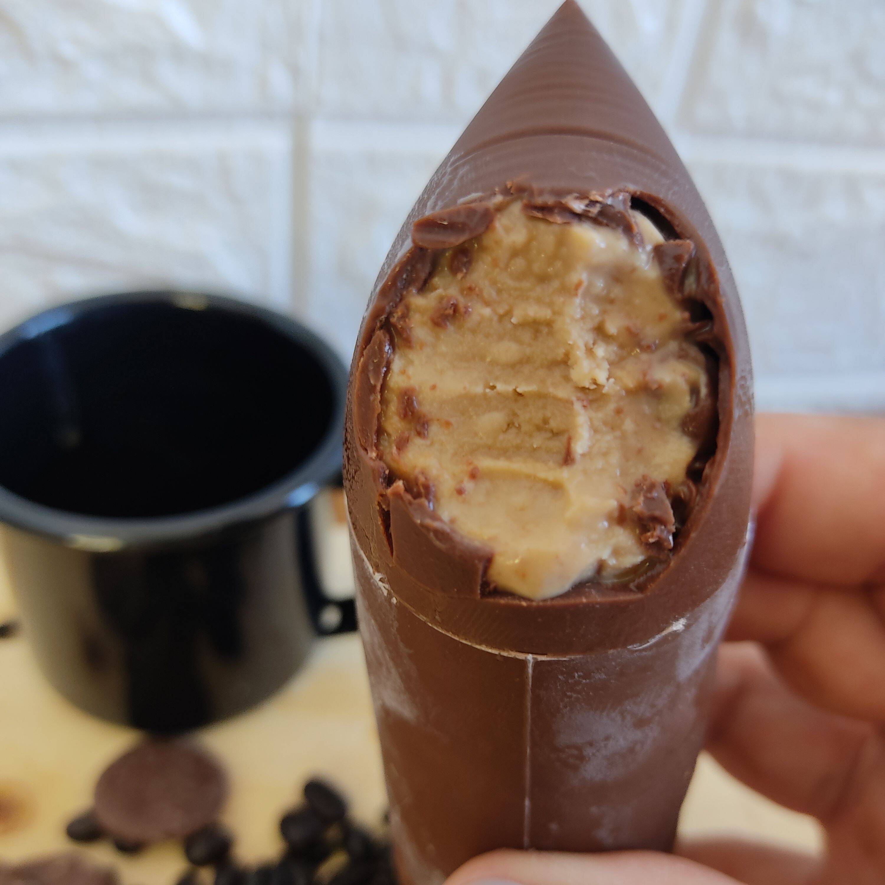 Delicioso geladinho de café cremoso, coberto por uma maravilhosa e generosa casquinha de chocolate blend.