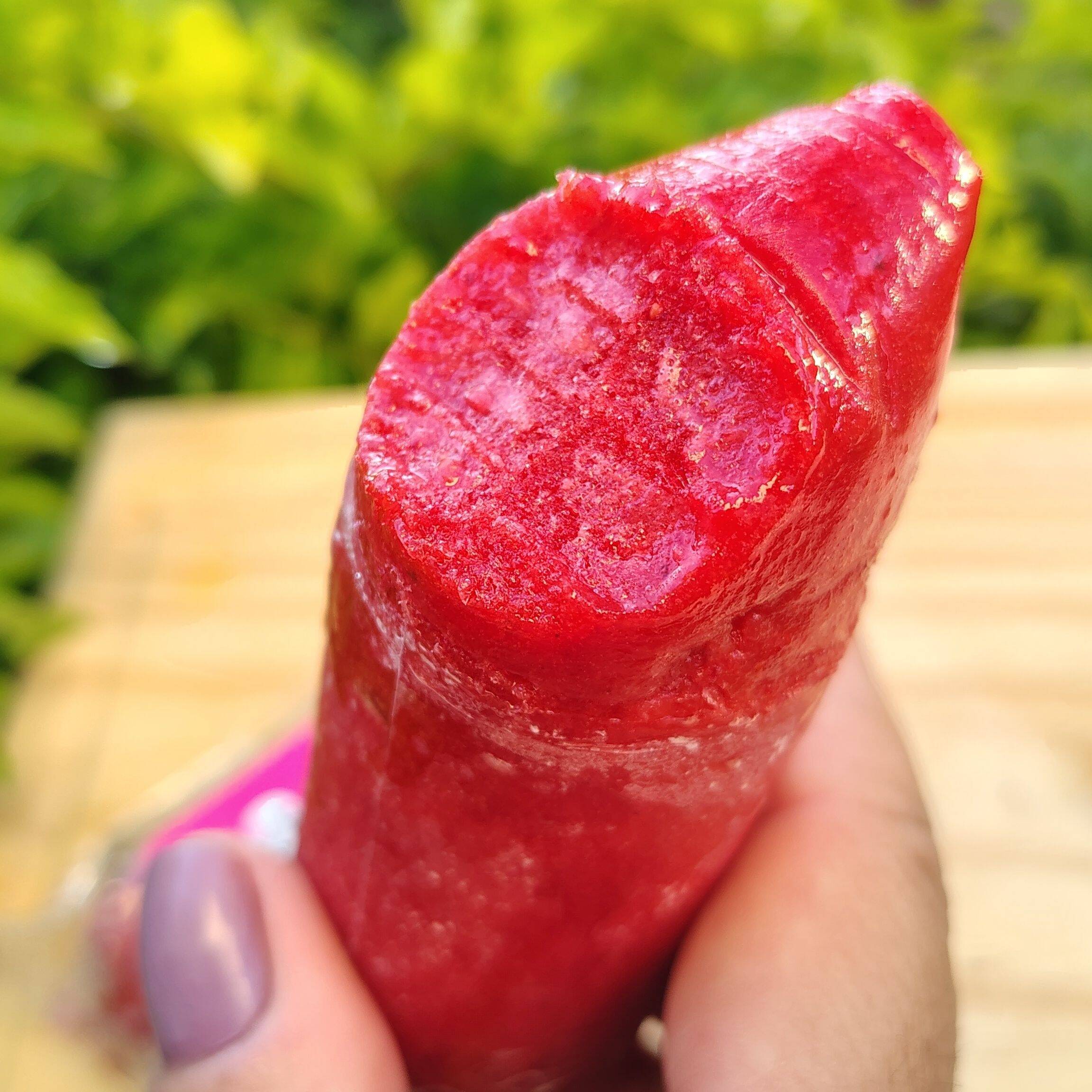 Delicioso e refrescante geladinho de morango. Feito com a pura fruta, sem adição de água ou leite. Levemente adoçado com açúcar fit.