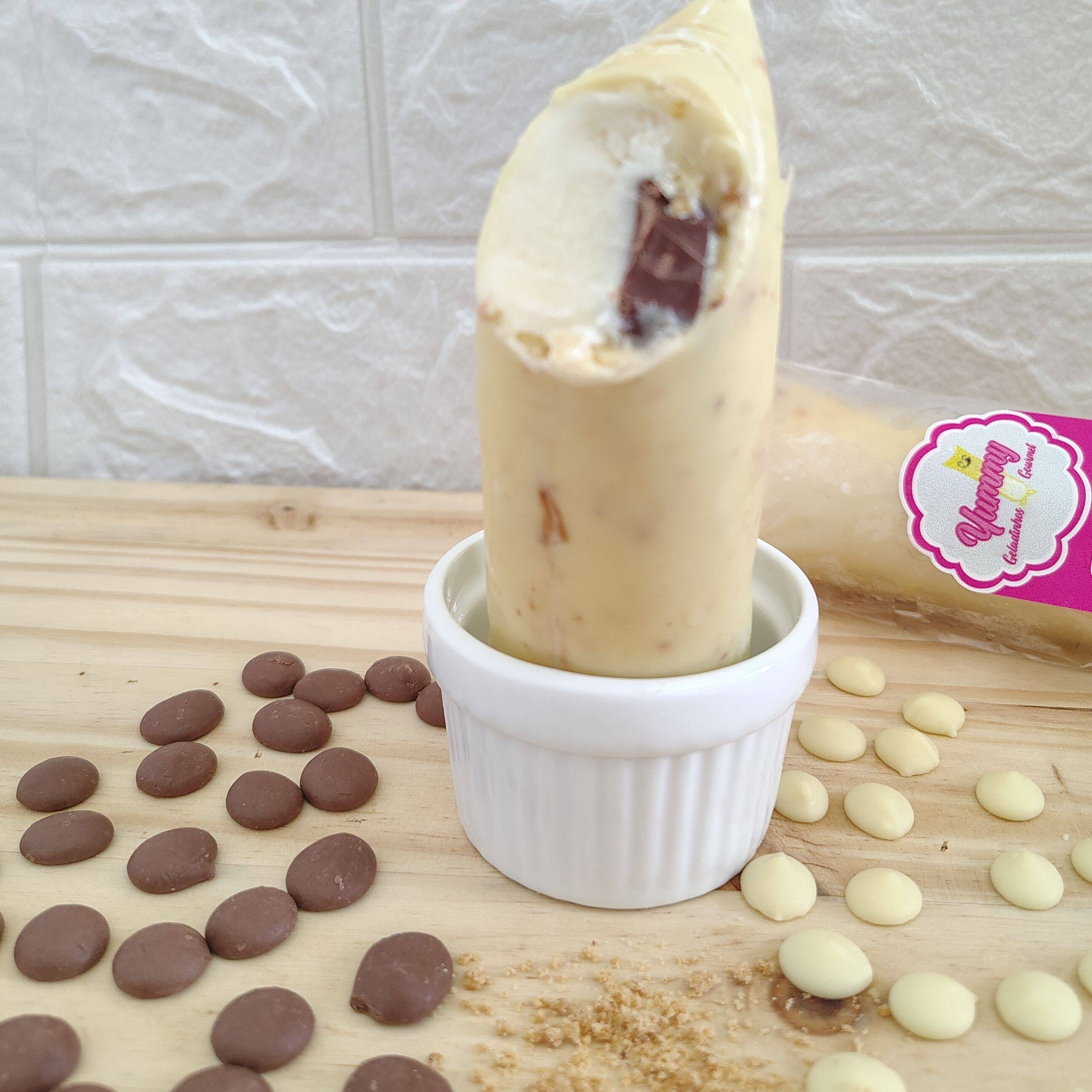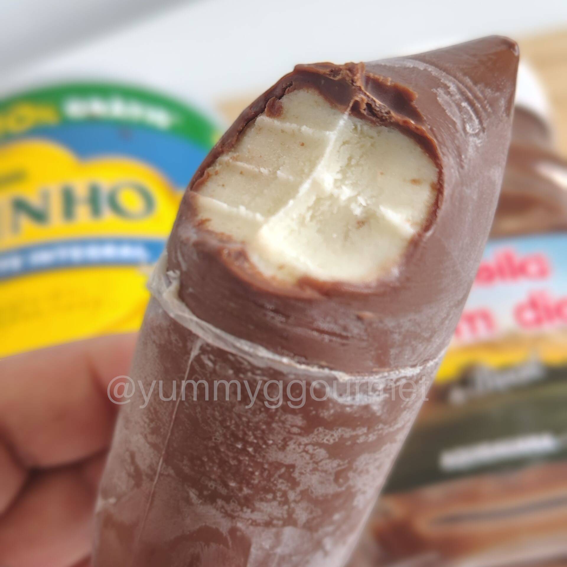 Geladinho sabor baunilha, recheado com uma irresistível barrinha de chocolate blend, coberto com uma generosa casquinha chocolate branco e Paçoca.