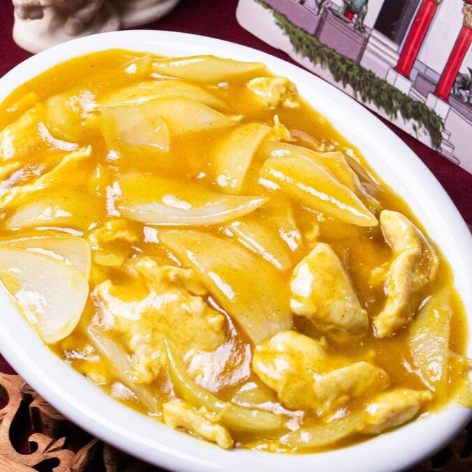 Finas fatias de frango ao molho curry com pétalas de cebola
