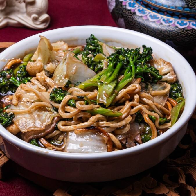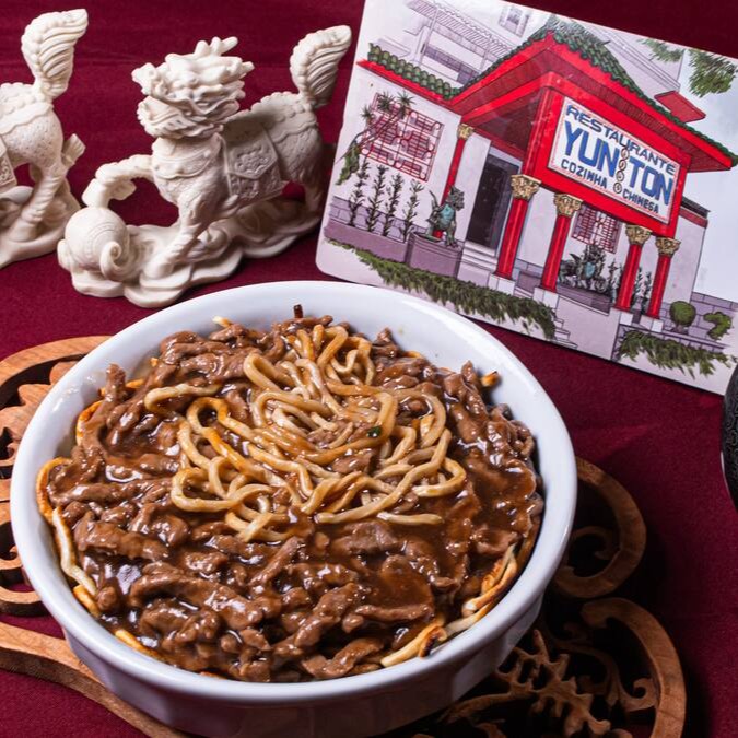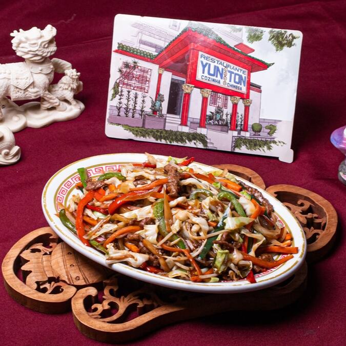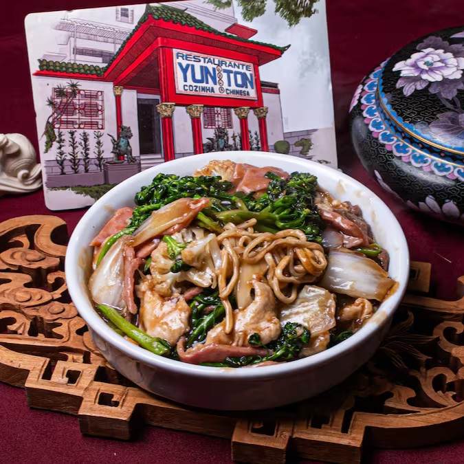 Autêntico macarrão chinês, presunto, carne de vaca, carne de frango, brócolis chinês, couve flor e acelga envolvidos no molho de soja