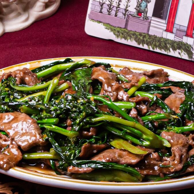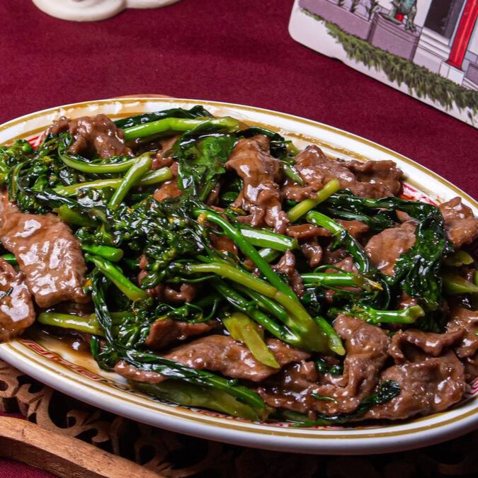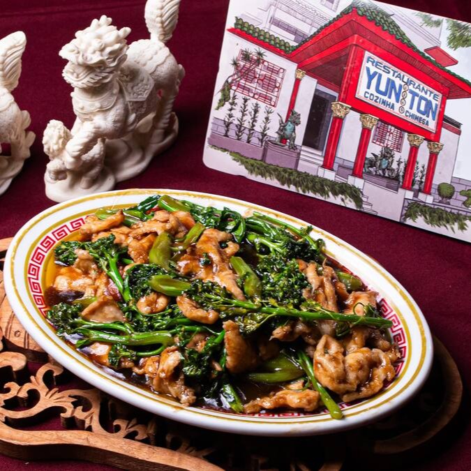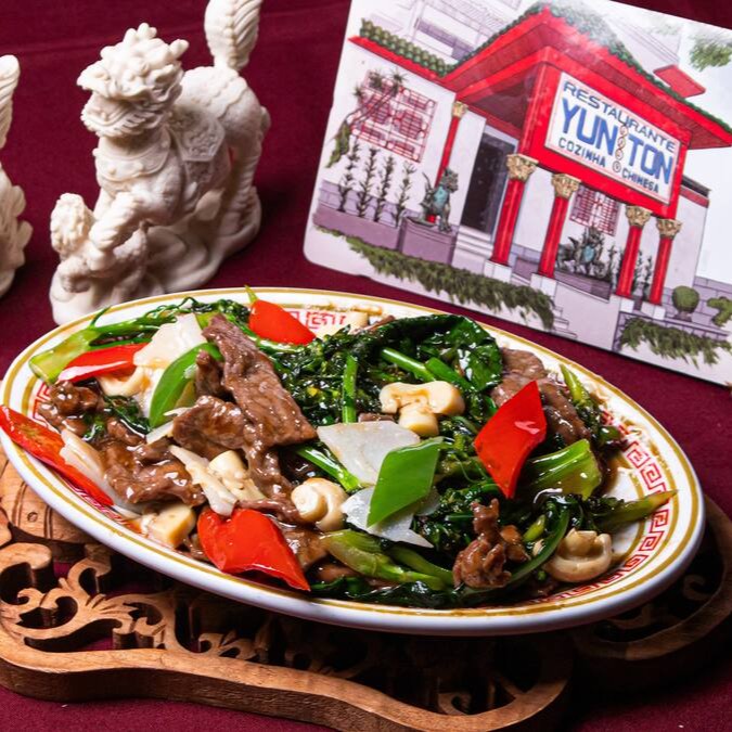 Carne de vaca, brócolis chinês, acelga, broto de bambu, pimentão e cebolinha envolvidos no molho de soja