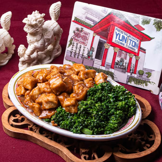 Frango xadrez ao molho de missô e alho acompanhado de brócolis e broto de feijão