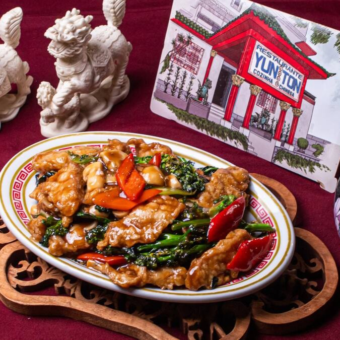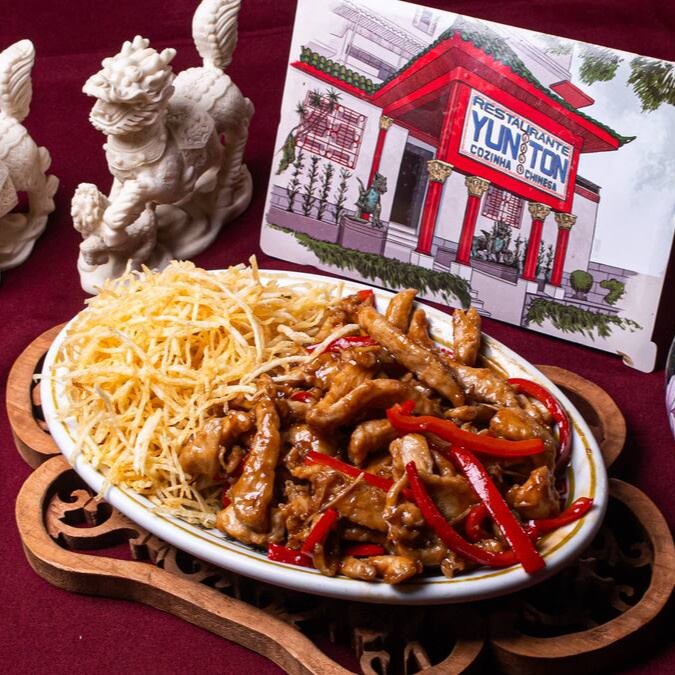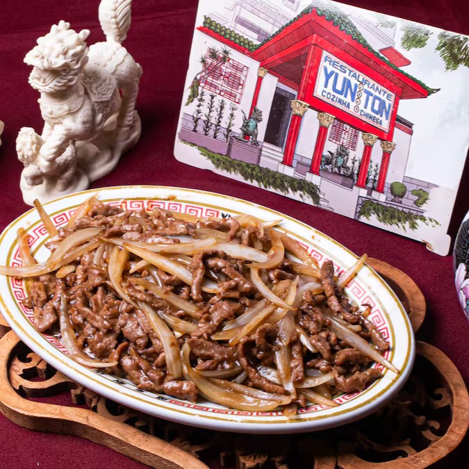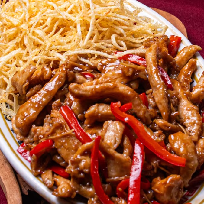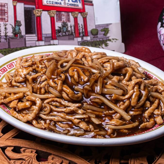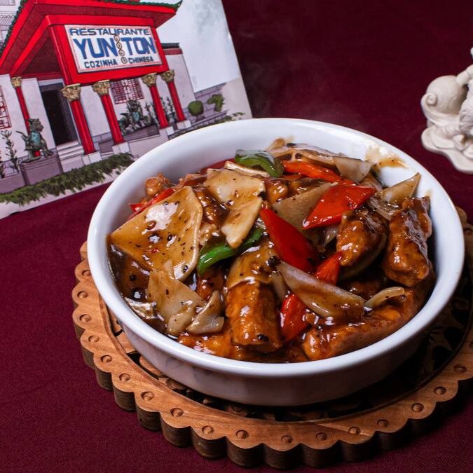 Lombo frito com pimentão, cebola, broto de bambu ao molho de feijão preto apimentado