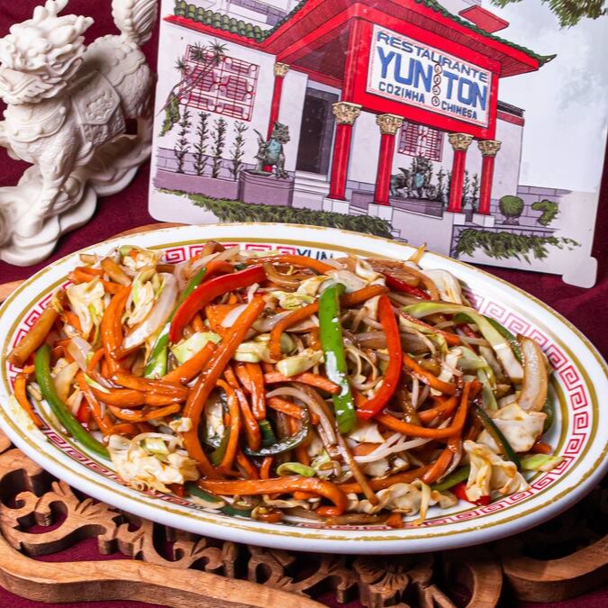 Repolho, cenoura, pimentão, cebola, broto de bambu e broto de feijão envolvidos no molho de soja