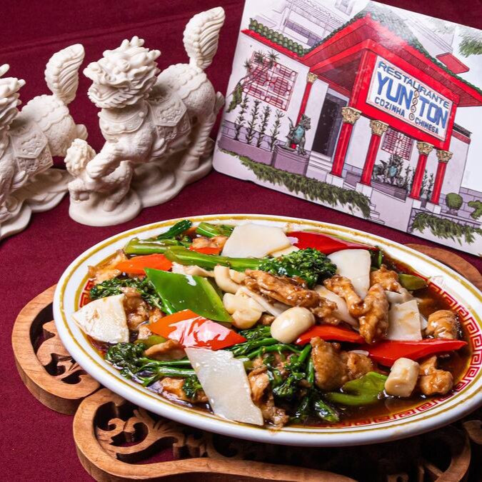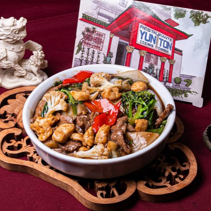 Carne de vaca, de frango, pimentão, brócolis chinês, broto de bambu, couve flor, acelga e cebolinha envolvidos no molho de soja