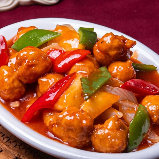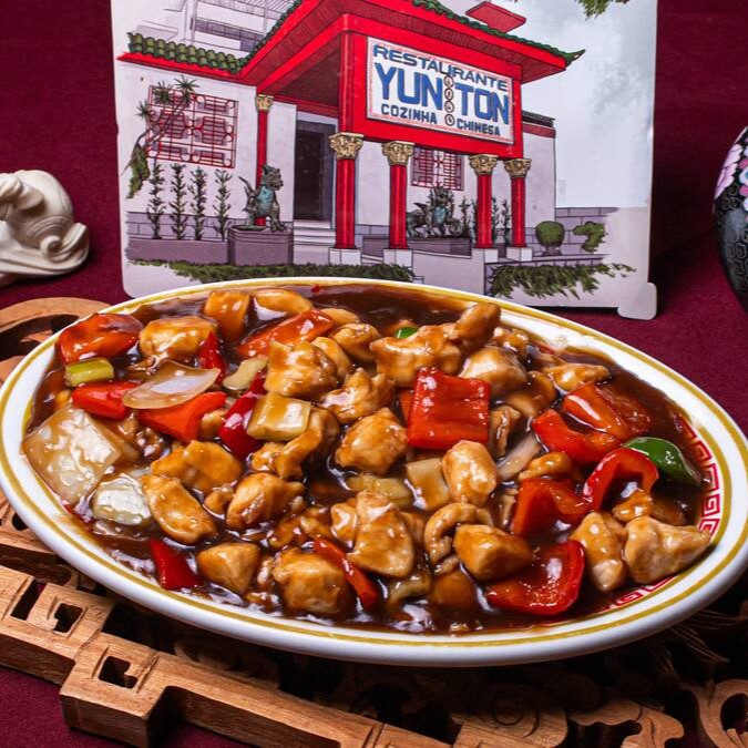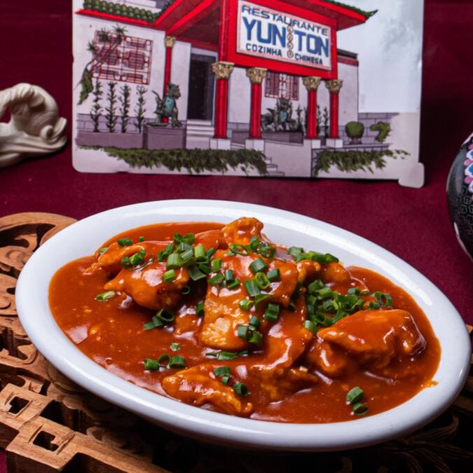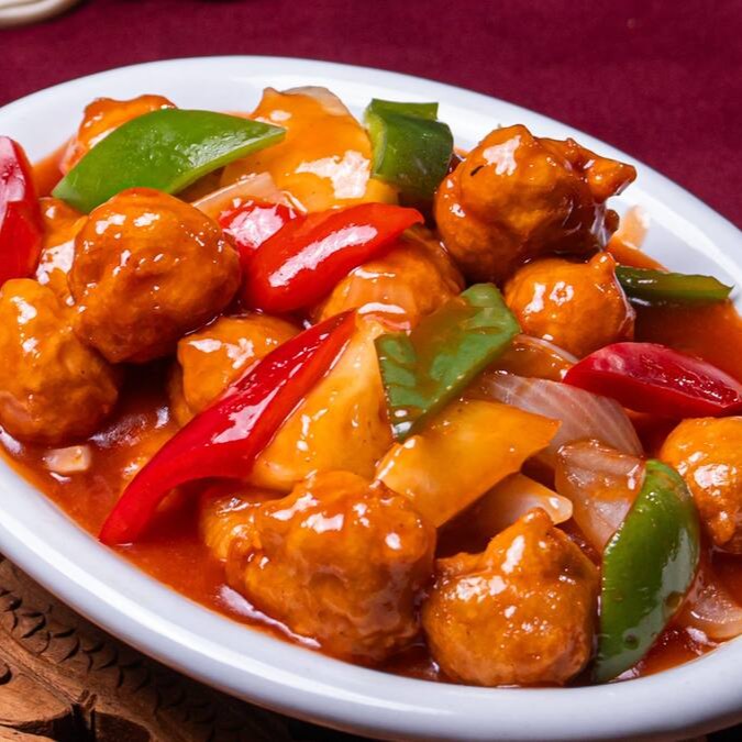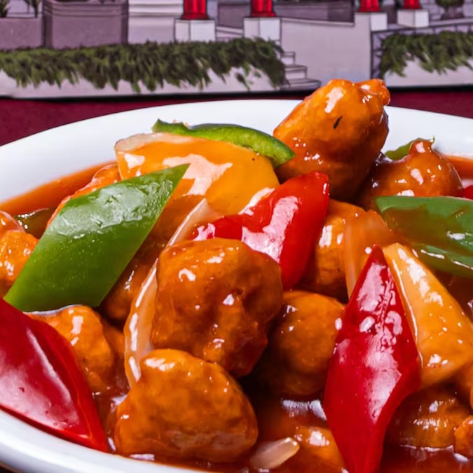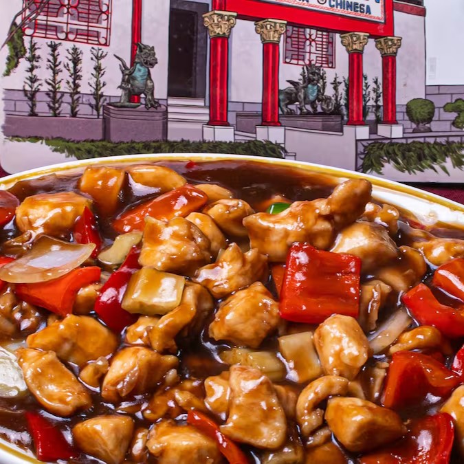Frango empando ao molho agridoce com pimentão, pétalas de cebola e abacaxi