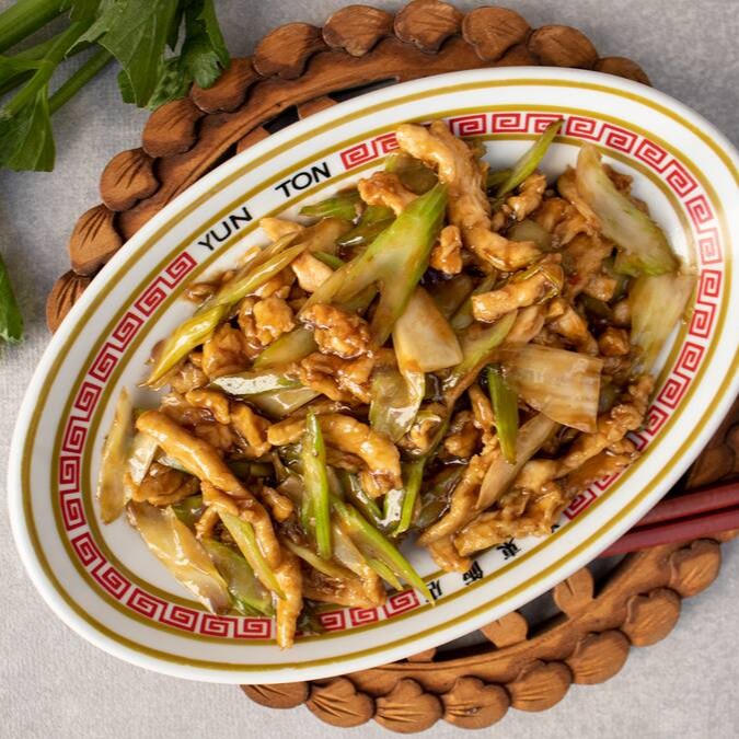 Frango e aipo cortados em forma de palito ao molho especial