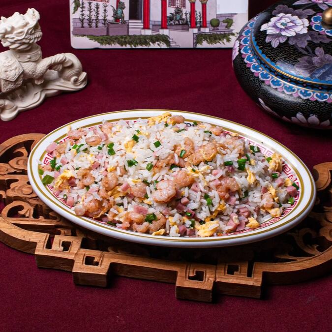 Arroz com camarão miúdo, presunto, ovo e cebolinha