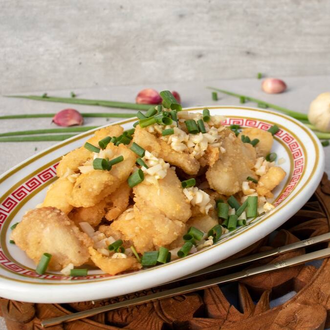 Fatias de peixe frito temperadas com alho e óleo.
