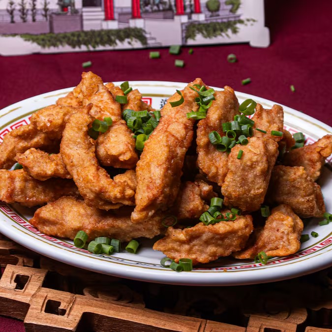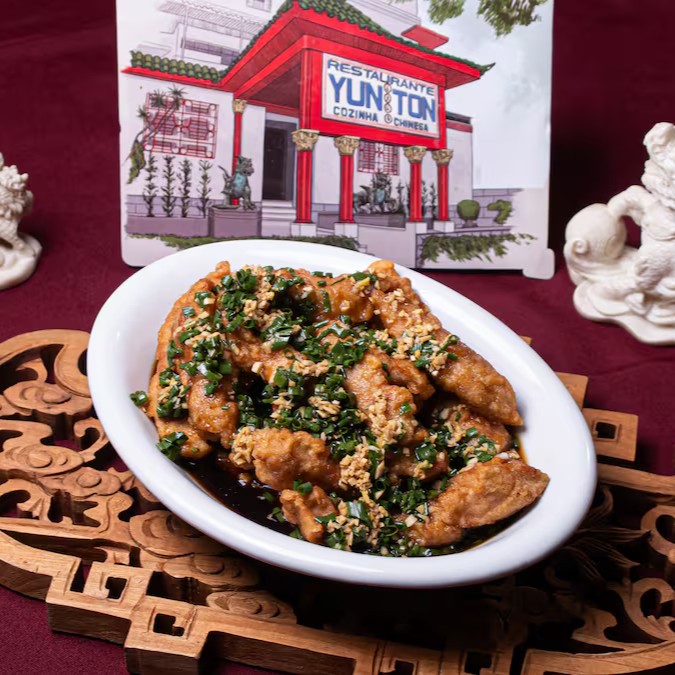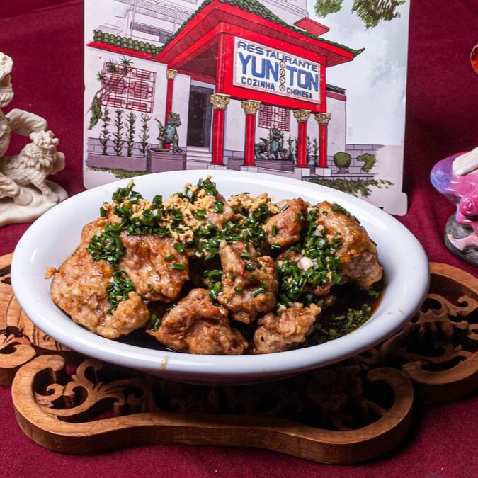 Lombo frito super crocante salpicado com cebolinha