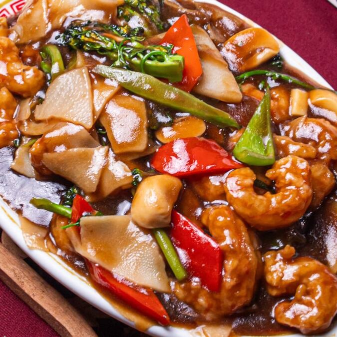 Camarão 40/50, brócolis chinês, broto de bambu, champignon e pimentão