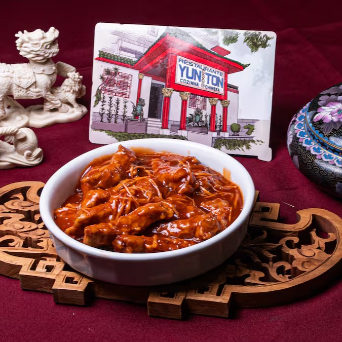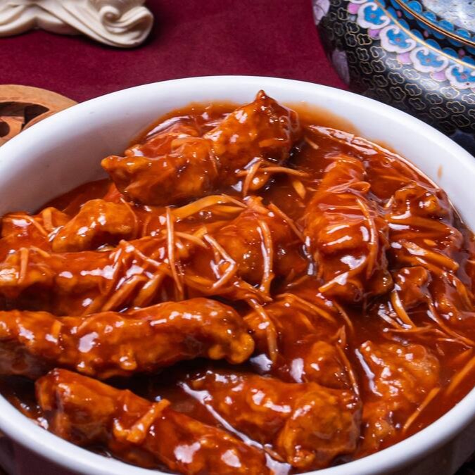 Lombo frito ao molho agridoce, molho de soja e gengibre desfiado