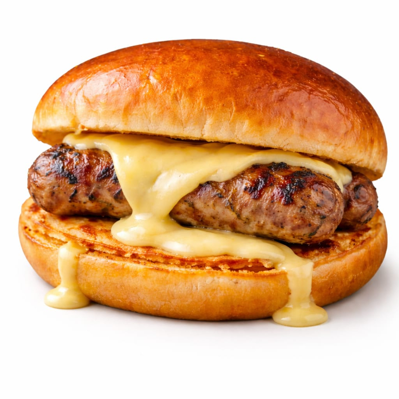 Pão de brioche, 2 linguiças de costela bovina 75g, queijo muçarela e maionese Grill.