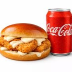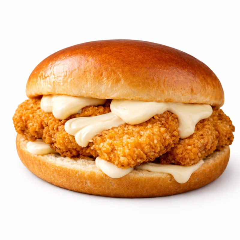Pão de brioche, filé de frango empanado 100g e maionese Grill.