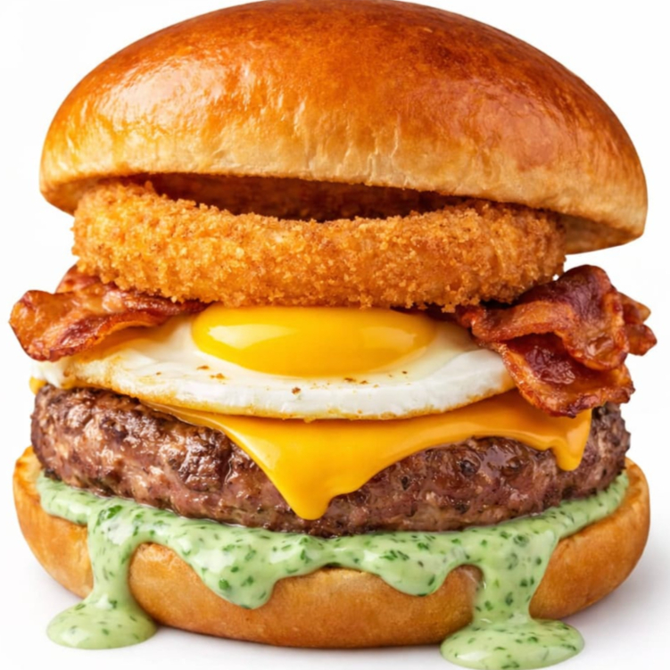 Pão de brioche, carne de hambúrguer 100% bovina de Wagyu 150g, ovo frito, bacon crocante, queijo cheddar, anel de cebola empanado e maionese de ervas..