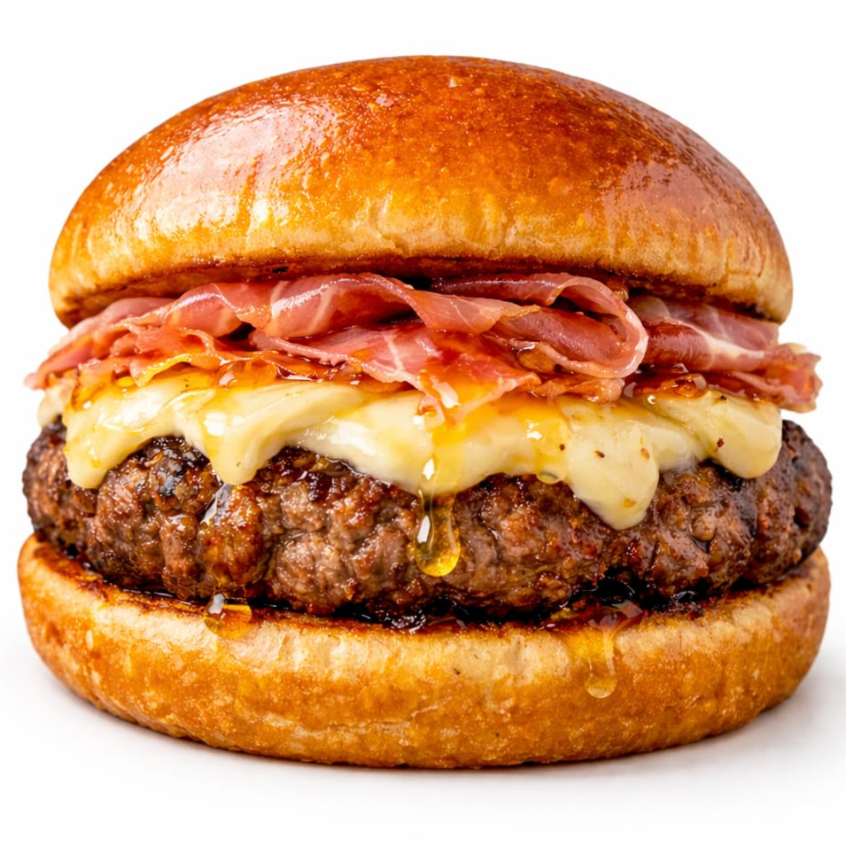 Pão de brioche, carne de hambúrguer 100% bovina de Wagyu 150g, presunto de Parma, queijo Brie, molho Hot Honey (mel com pimenta) e maionese Grill.