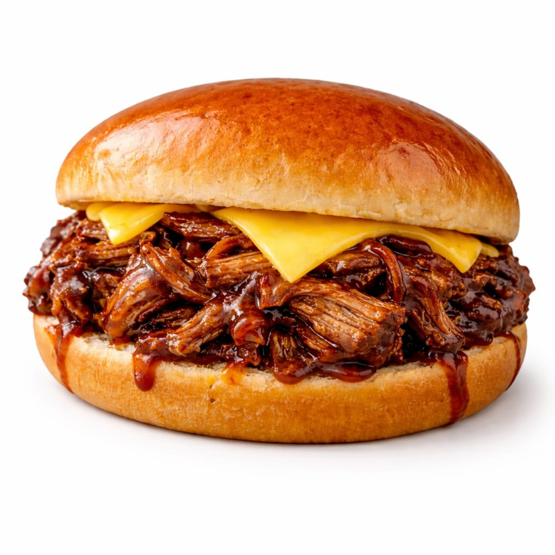 Pão de brioche, carne de costela bovina desfiada 100g, queijo cheddar e maionese Grill.