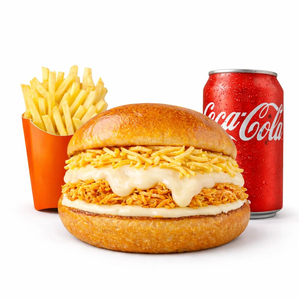 Hambúrguer De Frango Desfiado Com Requeijão Cremoso - Burger Da Neneca + Fritas + Bebida (refrigerante, Suco Ou Água)