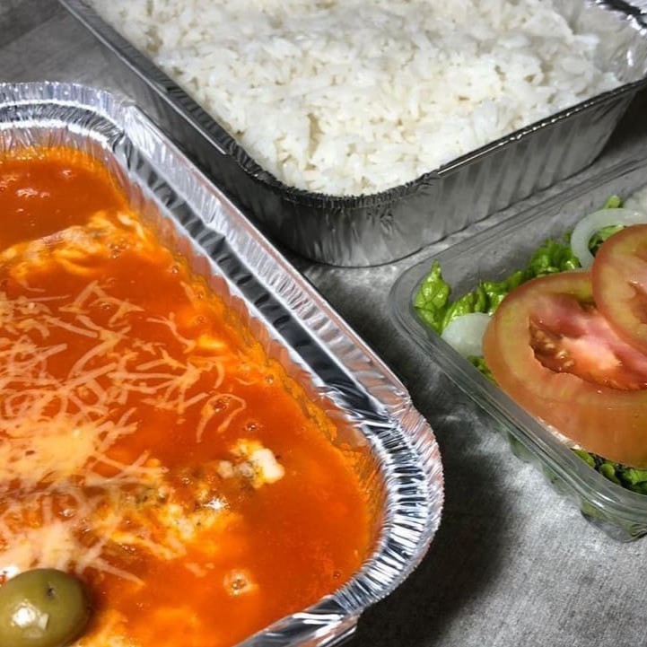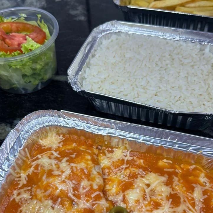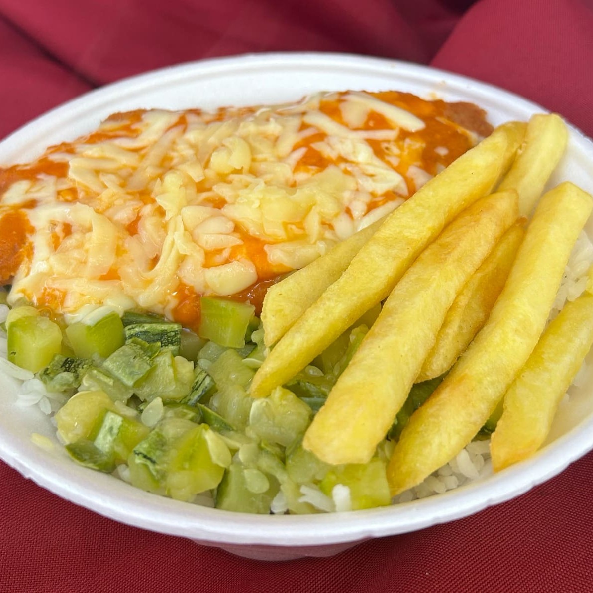 Berinjela empanada, coberta com molho de tomate artesanal e queijo mussarela. Acompanha arroz, batata frita e salada.