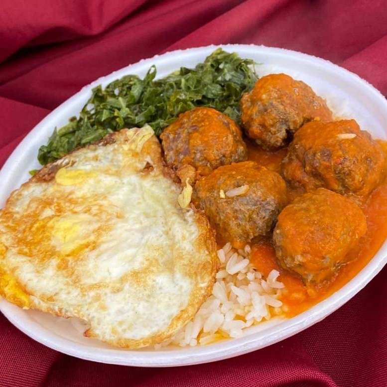 Arroz, feijão, almôndegas ao sugo, ovo frito e acelga refogada. Acompanha salada.