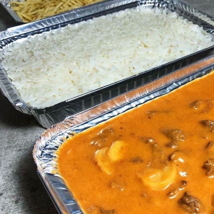 Strogonoff de filé mignon com champignon. Acompanha arroz, batata palha e salada.