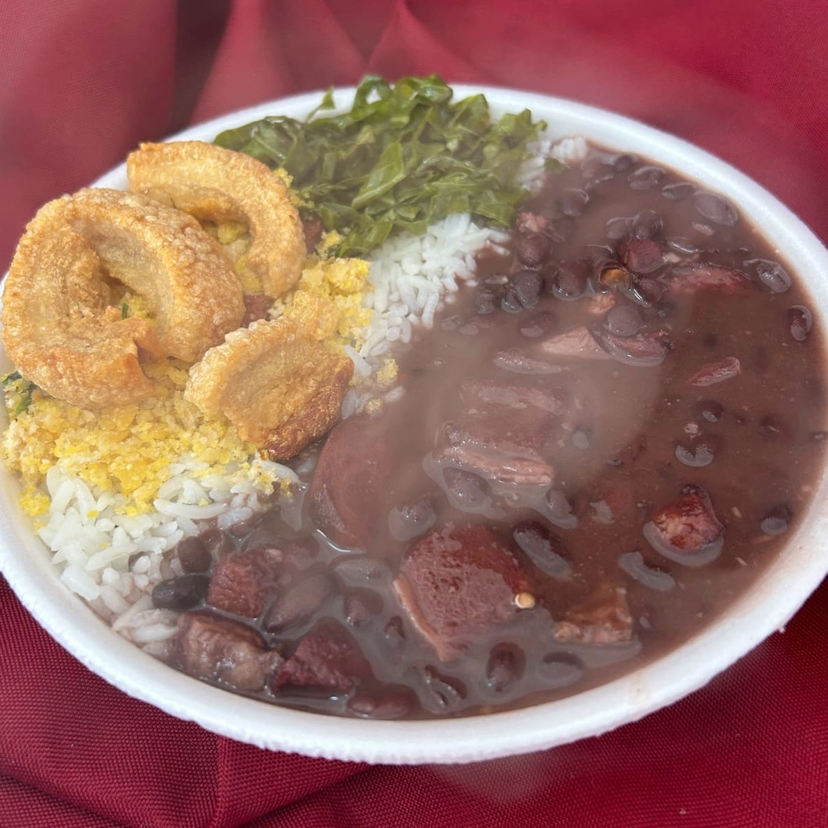 Arroz (marmitex G), feijoada (marmitex G), couve refogada, torresmo e farofa. Não acompanha salada.